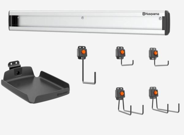Wandbefestigungs- / Aufbewahrungsset bestehend aus 1 Stück Lagerschiene 640 mm (weitere Lagerschienen zubestellbar), 5 Stück Haken , 1 Stück Zubehörregal für Lagerschiene (z.B. zur Ladegerätablage)