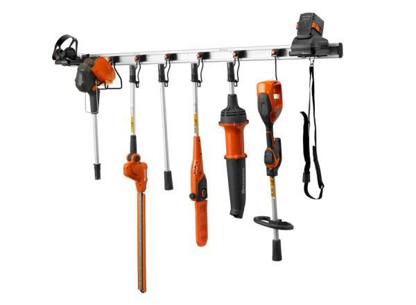 Wandbefestigungs- / Aufbewahrungsset bestehend aus 1 Stück Lagerschiene 640 mm (weitere Lagerschienen zubestellbar), 5 Stück Haken , 1 Stück Zubehörregal für Lagerschiene (z.B. zur Ladegerätablage)
